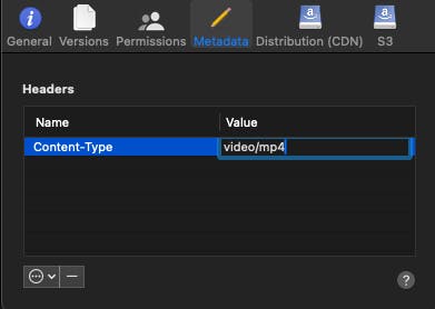 aws s3 --endpoint-url=http://eu-1.cdn77-storage.com cp s3://bucketname/ s3://bucketname/ --exclude "*" --include "*.mp4" --recursive --metadata-directive REPLACE --content-type video/mp4Cyberduck (example with MP4 file)