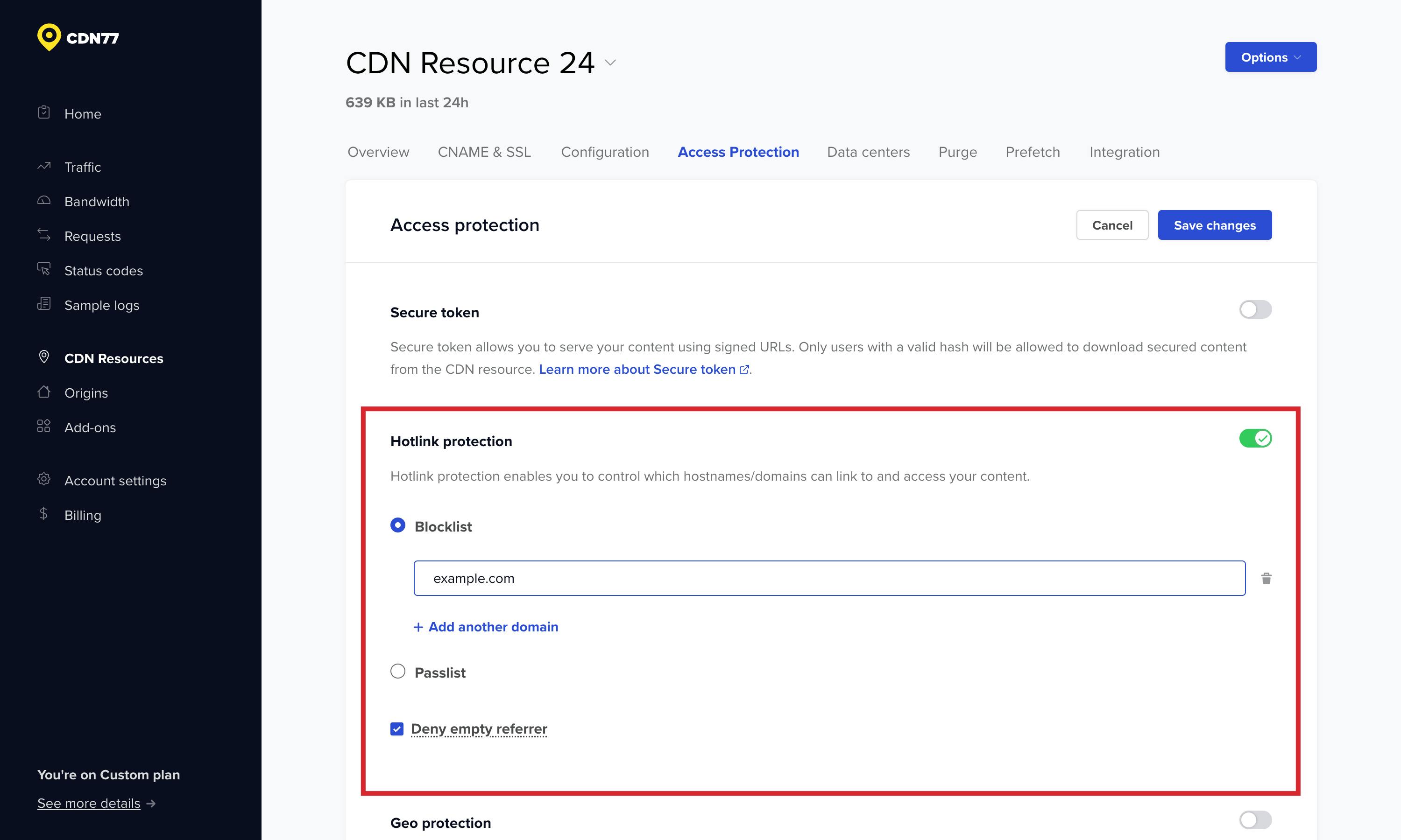 If you would like your CDN Resource to be accessible only via links from your website, you can set up hotlink protection for that specific CDN Resource. Hotlink protection works based on the "Referer:" header included in each HTTP request. You can easily set this for your CDN Resource from the "Access Protection" tab in your client section when selecting the CDN Resource.